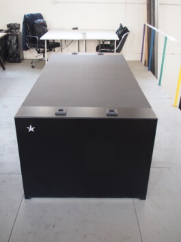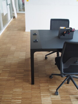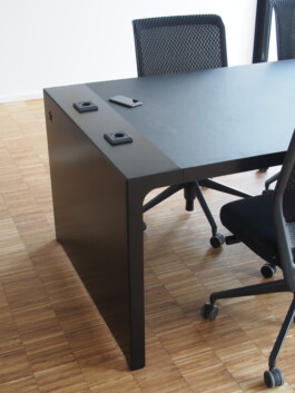When we received the inquiry from Kickbase for a new office table, we knew it had to be smart, and innovative and provide a new creative hub for the team. While the linoleum top offers the perfect surface to work, the lasered and curved steel plates give the table a sophisticated, unique look and feel. To represent and strengthen the Kickbase brand within the company, the logo was lasered into the sides and the colour was adapted to their matching colourway. To adapt to the client’s dynamic and energetic way of work, all four workstations got an invisible wireless charger and sockets fully integrated and recessed into the steel frame. With its size and features, the table provides the perfect environment to work and enables productive cooperation within the Kickbase team.