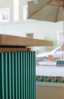 The café "Stulle & Stoff" is located in the middle of Haidhausen in a small old building shop typical for this area. In addition to coffee in the morning, guests are served cakes and other delicacies here. The heart of the shop is the large bar, which runs through the café in an L-shape. The counter covers the standard gastro tables and gives the store an appealing appearance. A refrigerated counter and a storage space are also integrated into the bar. In addition to these features, the L-shape also creates a small seating area by the window that can be used by the guests. The bar was made of solid oak and disguised with turquoise lacquered slats. Further, a rebate was milled into each of the slats to make the look of the bar even more ambitious. The bright appearance of the bar is a real eye-catcher even as you walk by and invites you to come in.
